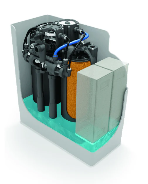 - Uses Block Salt- the reverse osmosis system is powered by a brine solution.